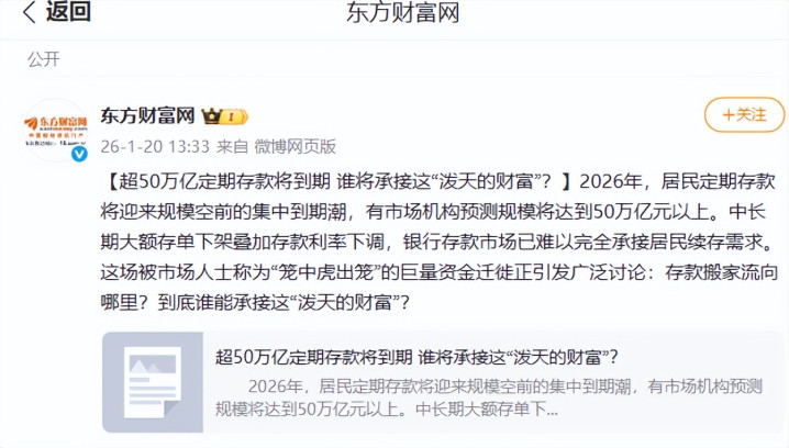 说到底,2026年的50万亿存款到期,更像是一次"财富管理的大体检",让大家重新思考自己的理财逻辑。低利率时代,想靠存款赚大钱已经不现实,但也不用焦虑——财富管理是一场长期修行,不是比谁赚得快,而是比谁稳得久。